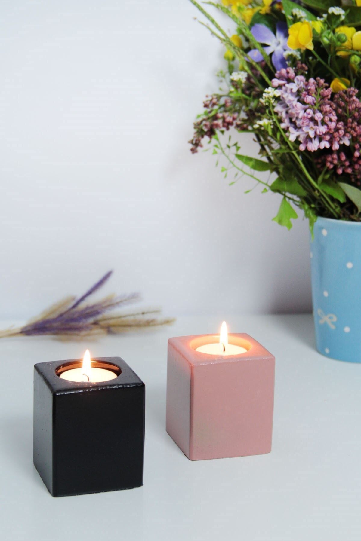 Bu şık dekoratif ürünlerimiz ev ve ofislerinize modern bir görünüm katacaktır Ürünlerimiz 1. sınıf betondan üretilmektedir . 3 kat boya 2 kat vernik atılmaktadır . 2 adet kare mumluk olarak gönderilecektir, yanında 2 adet t – light mumluk ile birlikte gönderilecektir . ; Yükseklik 6.5 , en 5.5 cm dir.;