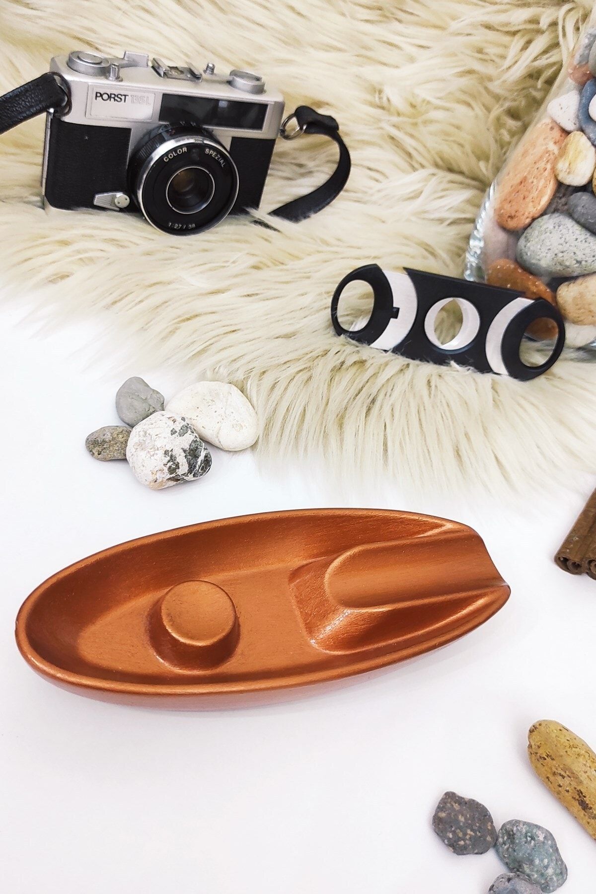 Ürün betondan üretilmiştir . ; 1 adet puro küllüğü ve 1 adet puro kesme makası için geçerli fiyattır . ; Görsel amaçlı kullanılan diğer dekoratif ürünler fiyata dahil değildir. ; Sağlığa zararsız su bazlı akrilik boya ile boyanmış , vernik ile korumaya alınmıştır . ; Ürünler el imalatıdır , betondan imal edildiği için hava kabarcığı gibi şeyler olabilmektedir . ; Ölçüleri : uzunluk 17 cm , genişlik 6.5 cm , yükseklik 3 cm;
